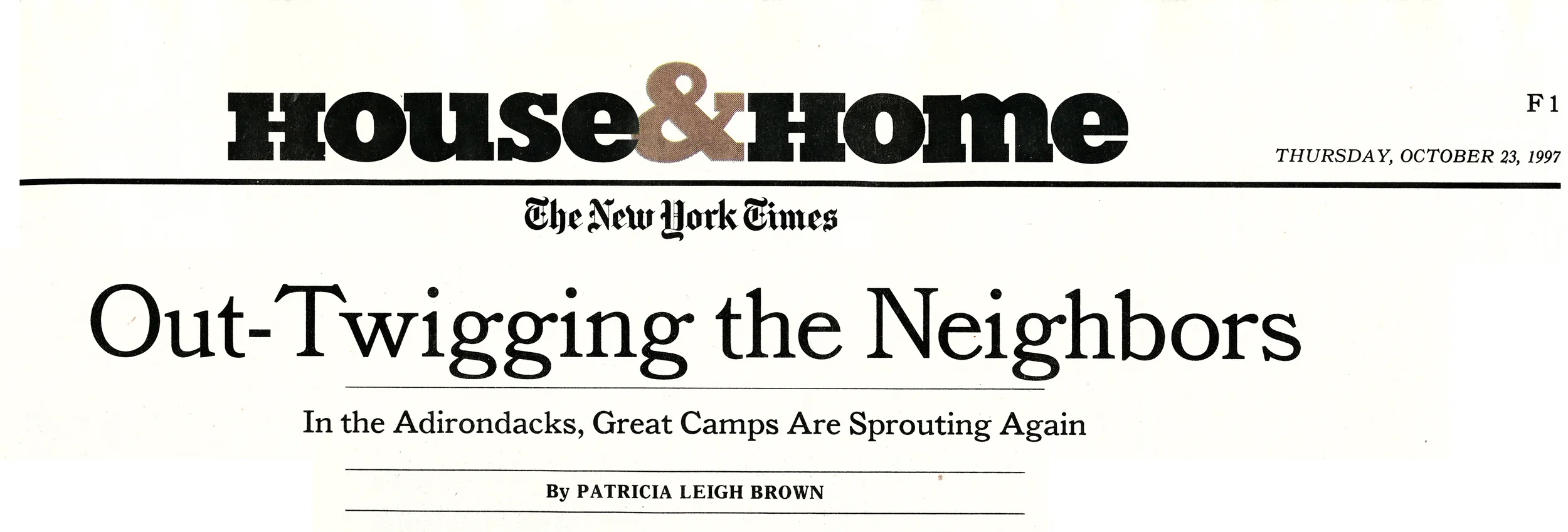 The New York Times, “Out-Twigging The Neighbors- In the Adirondacks, Great Camps Are Sprouting Again,” Patricia Leigh Brown, October 23, 1997; syndicated to the The Washington Post, The LA Times, The Chicago Tribune, The Cleveland Plain Dealer & Atlanta Journal- Constitution.
